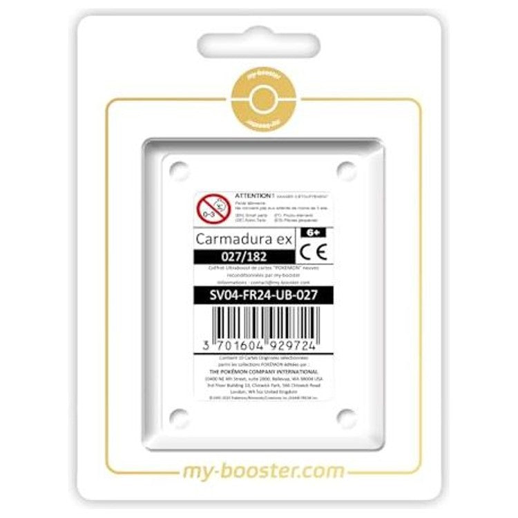 Cette carte officielle française de Faille Paradoxe présente des attaques gourmandes en Énergies Feu mais capables de gros dégâts soutenus, idéale dans un deck offensif centré sur les Pokémon Feu. Ce coffret Myboost contient Carmadura ex comme carte vedette ainsi que 9 autres cartes Pokémon variées, toutes certifiées d’origine et sans doublon.