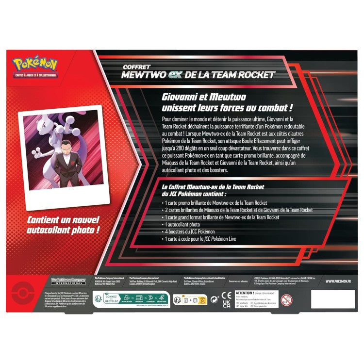 Vous trouverez dans ce coffret ce puissant Pokémon-ex en tant que carte promo brillante, accompagné de Miaouss de la Team Rocket et Giovanni de la Team Rocket, ainsi qu'un autocollant photo et des boosters du JCC Pokémon Écarlate et Violet !