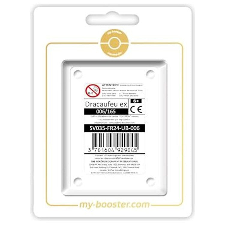 Cette édition ex française met en avant une forte valeur collection et un artwork moderne, idéal pour sublimer un classeur ou un display. Ce coffret Myboost contient Dracaufeu ex accompagné de 9 cartes variées, toutes certifiées d’origine et sous licence The Pokémon Company, pour enrichir votre collection Écarlate et Violet 151.
