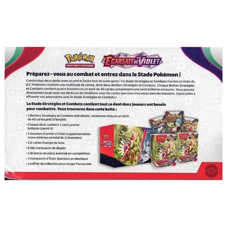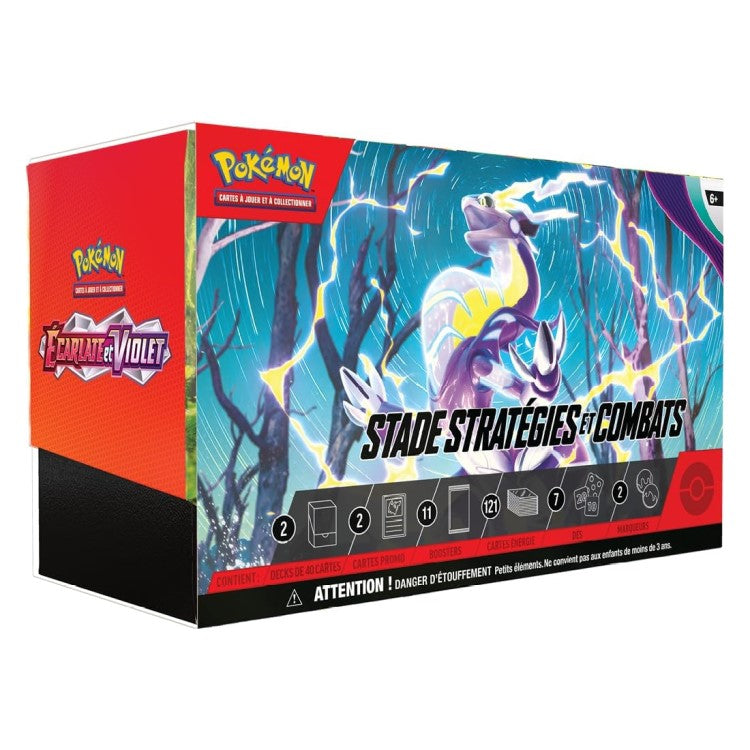 Construisez deux decks avec un ami et jouez tout de suite après ! Ce stade Stratégies et Combats Écarlate et Violet du JCC Pokémon contient une multitude de cartes, dont deux Boitiers Stratégies et Combats. Chaque Boitier Stratégie et Combats contient quatre boosters et un deck de 40 cartes comprenant uen carte brillante exclusive.