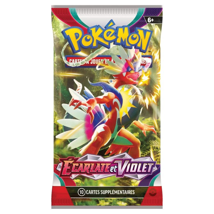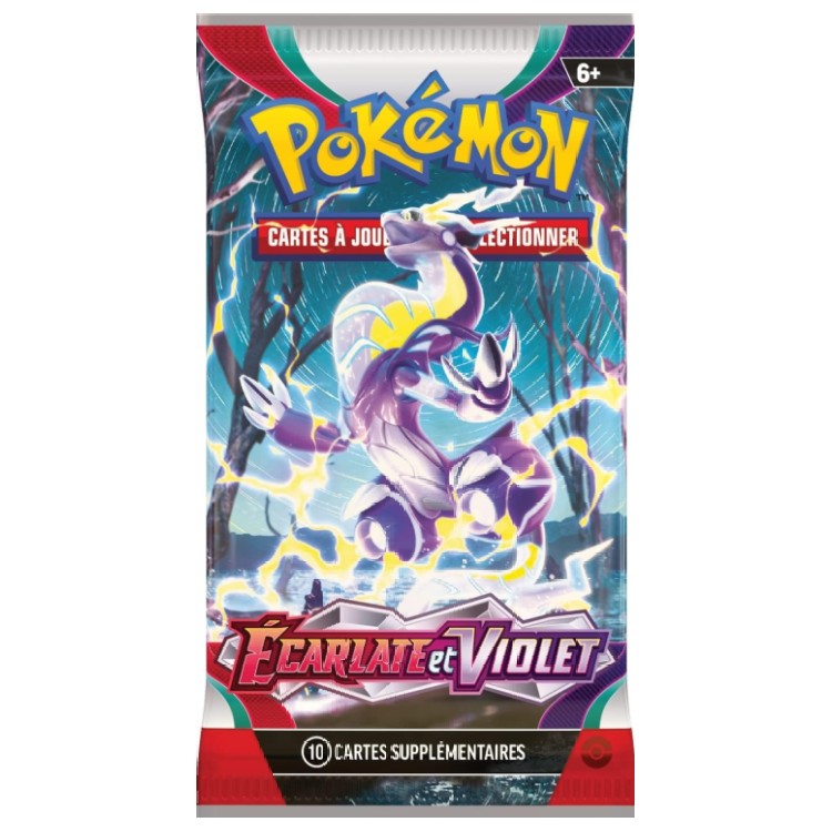 Retrouvez les Pokémon légendaires Koraidon et Miraidon, symboles de cette extension, ainsi que les starters Poussacha, Chochodile et Coiffeton, dans des versions spectaculaires. Chaque booster est une chance de découvrir des cartes brillantes, des illustrations alternatives ou des dresseurs emblématiques comme Menzi ou Pepper.