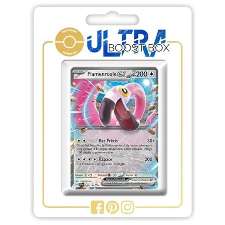 Cette carte officielle française de l’extension Étincelles Déferlantes est mise en avant dans ce coffret Ultraboost, qui contient Flamenroule ex 160/191 accompagné de 9 cartes complémentaires. Un assortiment parfait pour enrichir une collection orientée type Feu ou renforcer une stratégie offensive basée sur des Pokémon ex récents.