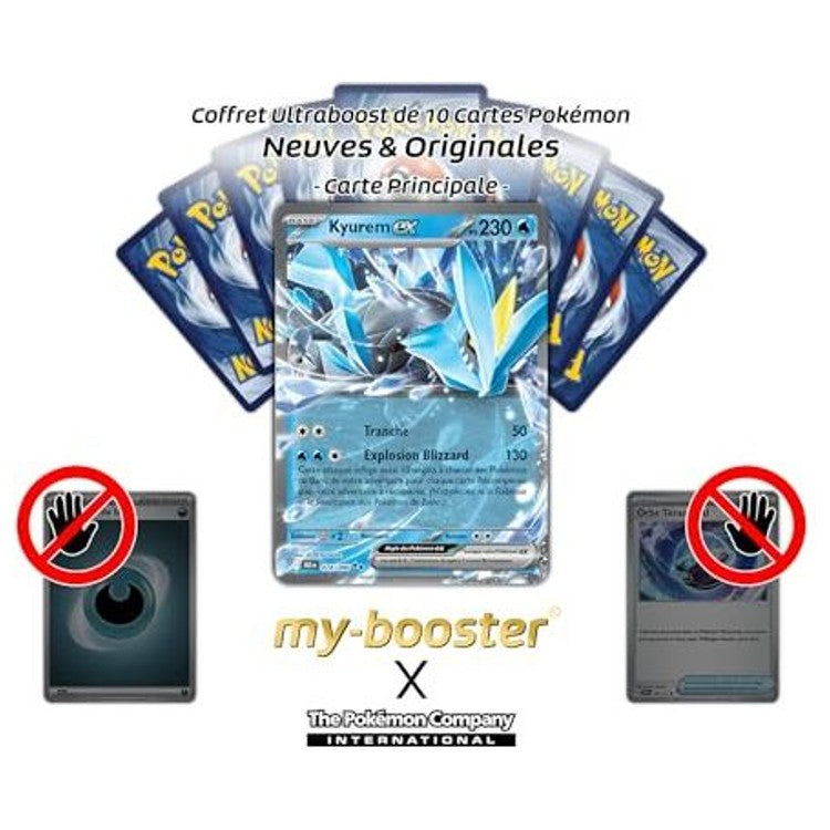 Ce coffret Ultraboost / Myboost contient Kyurem ex comme carte principale, accompagné de 9 cartes complémentaires françaises certifiées d’origine. Cet assortiment sous licence The Pokémon Company propose une sélection variée pour enrichir votre classeur, avec des cartes sans doublon pouvant provenir de plusieurs extensions Pokémon différentes.
