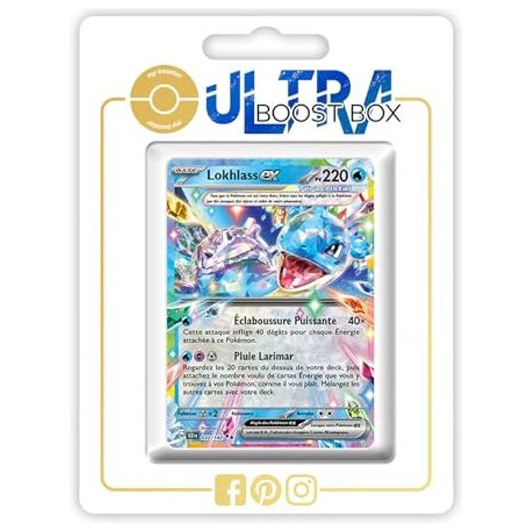 Cette édition met l’accent sur la dimension collector : ce coffret Myboost contient Lokhlass ex accompagné de 9 cartes complémentaires pour enrichir votre collection Écarlate et Violet. Carte officielle en français, certifiée d’origine et sous licence The Pokémon Company, idéale pour les fans de Lokhlass et les collectionneurs d’Ultra Rares Téracristal.
