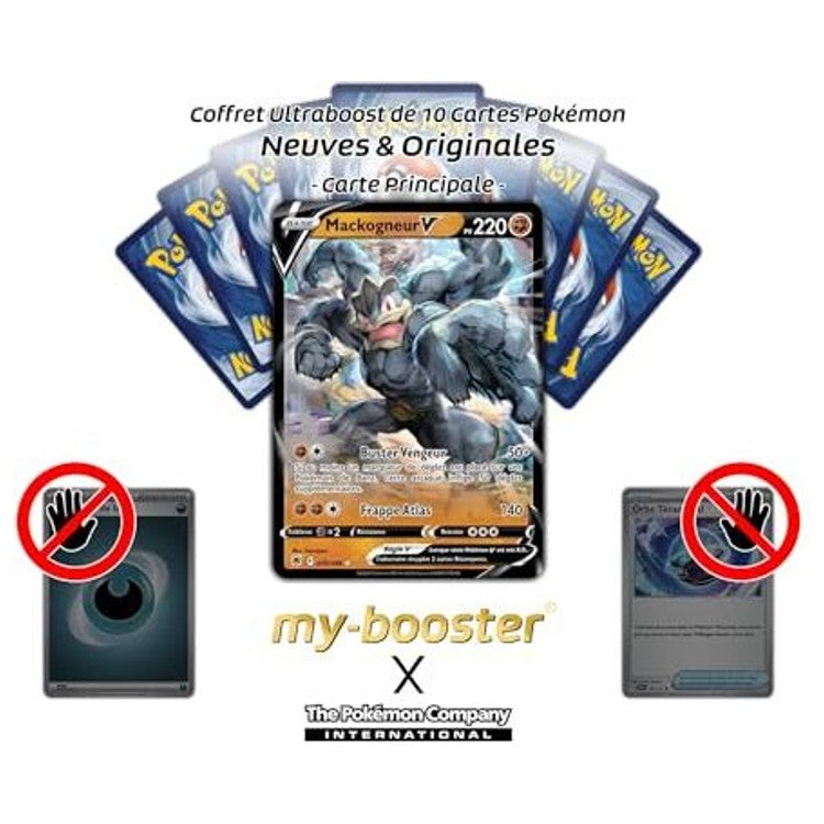 Ce coffret Ultraboost/Myboost contient Mackogneur V accompagné de 9 cartes complémentaires sans doublon, toutes certifiées d’origine sous licence The Pokémon Company. Un assortiment pensé pour renforcer vos lignes Combat tout en offrant une sélection variée de Pokémon issus de plusieurs séries.
