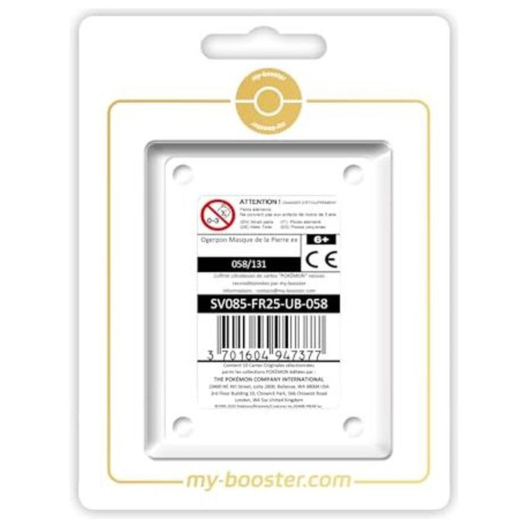 Ce coffret Ultraboost / Myboost contient la carte principale Ogerpon Masque de la Pierre ex Téracristal ainsi que 9 cartes complémentaires certifiées d’origine, toutes en français et sous licence officielle The Pokémon Company.