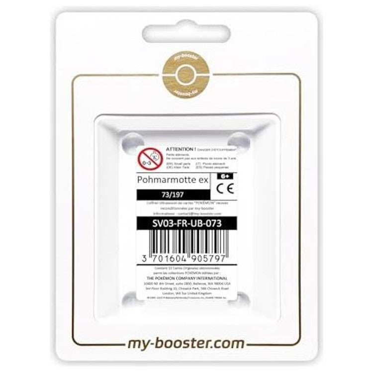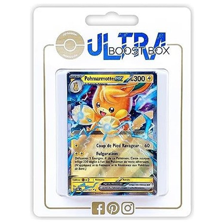 Ce coffret Ultraboost & Myboost contient Pohmarmotte ex accompagné de 9 cartes Pokémon complémentaires, toutes neuves, certifiées d’origine et sans doublon. Un assortiment parfait pour renforcer une collection Écarlate et Violet ou construire un deck moderne centré sur le type Électrik.