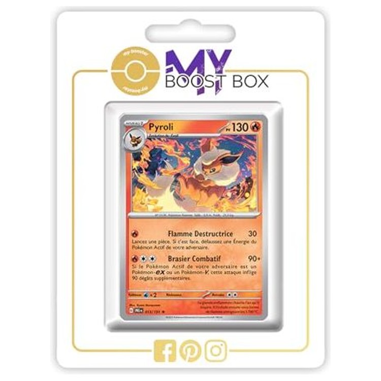Pyroli, l’évolution de type Feu d’Évoli réputée pour sa fourrure incandescente, se présente ici dans une version 013/131 Holo ou Reverse idéale pour les decks Feu. Ce Pokémon mise sur des attaques brûlantes alimentées en Énergies Feu pour infliger une pression constante et achever les Pokémon affaiblis.