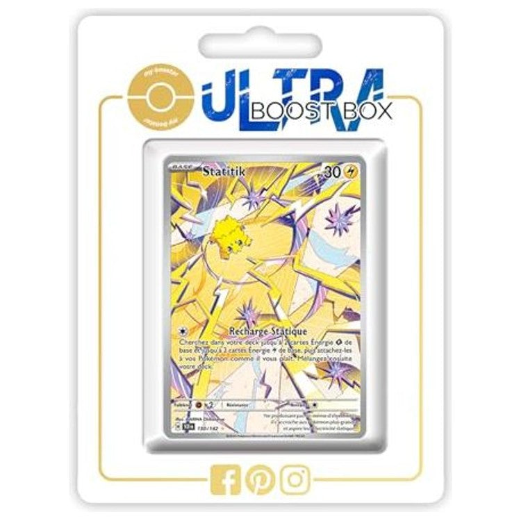 Cette édition met l’accent sur la dimension collection avec une rareté secrète et un artwork de galerie, idéale pour les fans de Pokémon Électrik. Ce coffret Myboost contient Statitik comme carte vedette accompagnée de 9 cartes variées, toutes en édition française authentique sous licence The Pokémon Company.