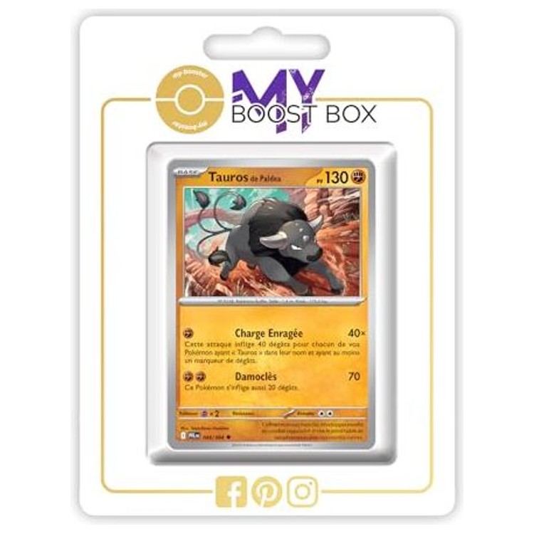 Cette version Reverse met en valeur l’illustration de Tauros grâce à un effet brillant sur tout le fond, tandis que ses PV solides et ses attaques à coût Combat ciblé s’intègrent idéalement dans des stratégies basées sur la pression constante. Ce coffret Myboost contient également 9 autres cartes Pokémon variées, toutes officielles et en français.