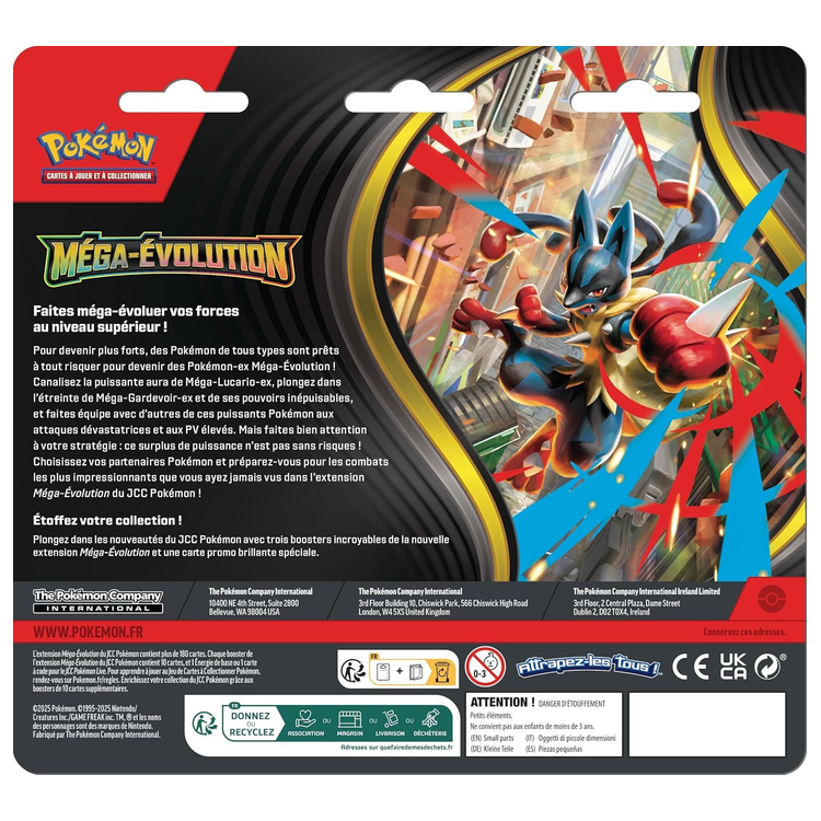 Pour devenir plus forts, des Pokémon de tous types sont prêts à tout risquer pour devenir des Pokémon-ex Méga-Évolution ! Canalisez la puissante aura de Méga-Lucario-ex, plongez dans l’étreinte de Méga-Gardevoir-ex et de ses pouvoirs inépuisables, et faites équipe avec d’autres de ces puissants Pokémon aux attaques dévastatrices et aux PV élevés.
