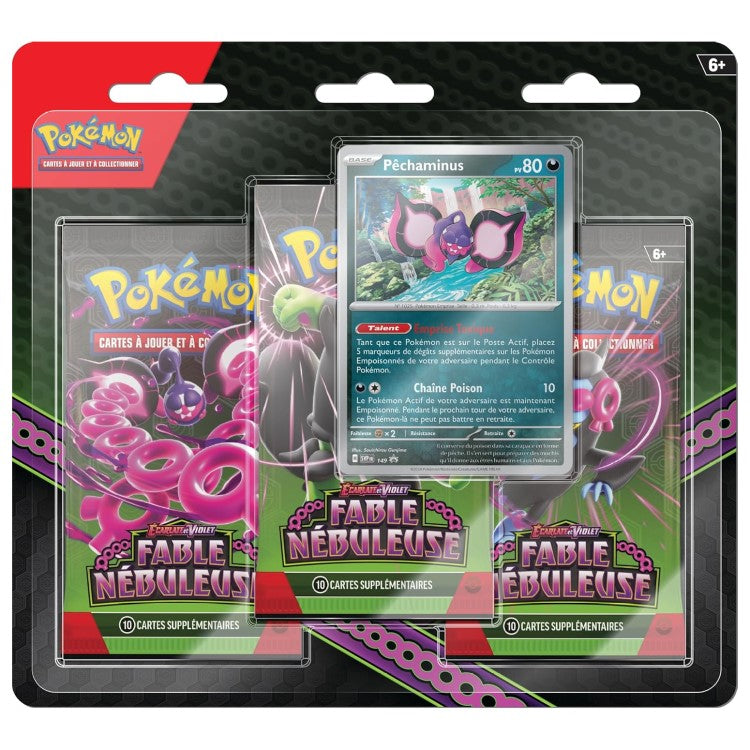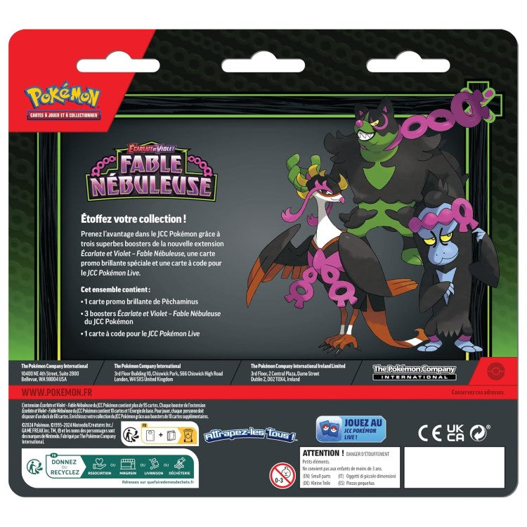Prenez l'avantage dans le JCC Pokémon grâce à trois superbes boosters de l'extension Écarlate et Violet - Fable Nébuleuse, une carte promo brillante spéciale du Pokémon Pêchaminus et une carte à code pour le JCC Pokémon live !
