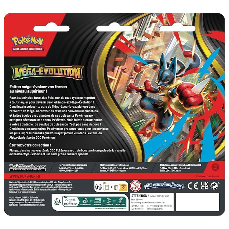 Pour devenir plus forts, des Pokémon de tous types sont prêts à tout risquer pour devenir des Pokémon-ex Méga-Évolution ! Canalisez la puissante aura de Méga-Lucario-ex, plongez dans l’étreinte de Méga-Gardevoir-ex et de ses pouvoirs inépuisables, et faites équipe avec d’autres de ces puissants Pokémon aux attaques dévastatrices et aux PV élevés.